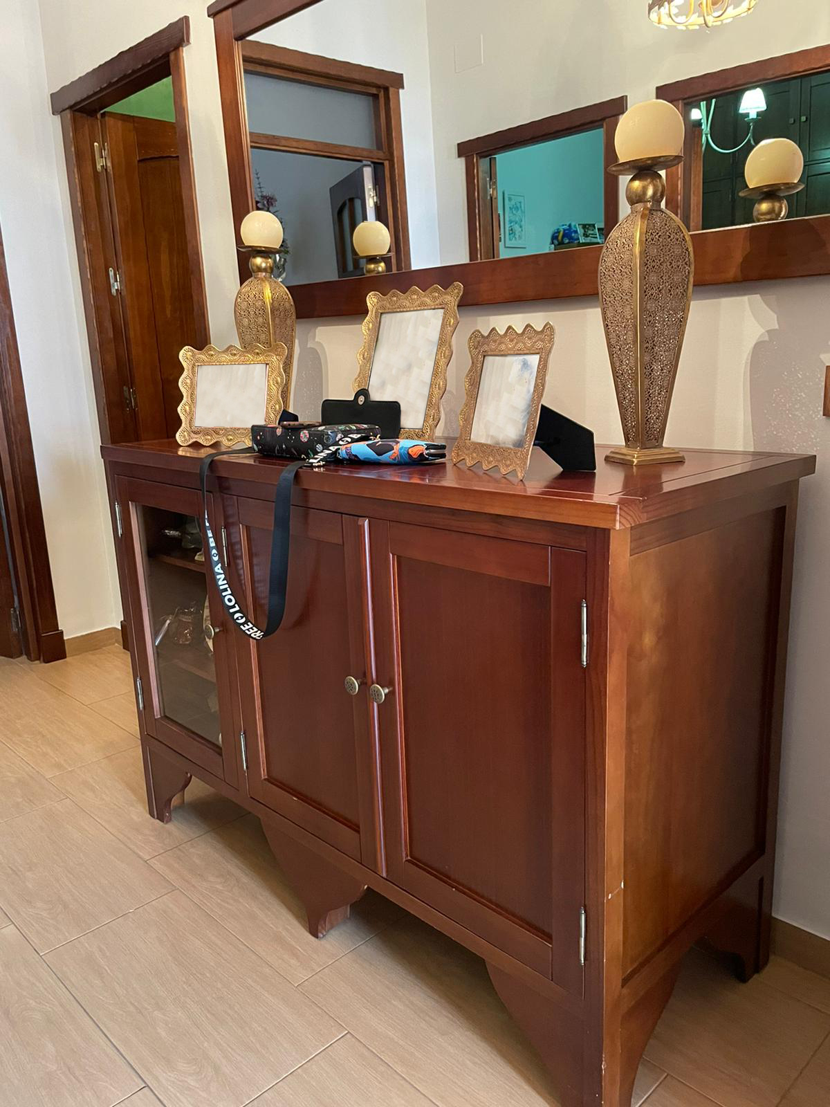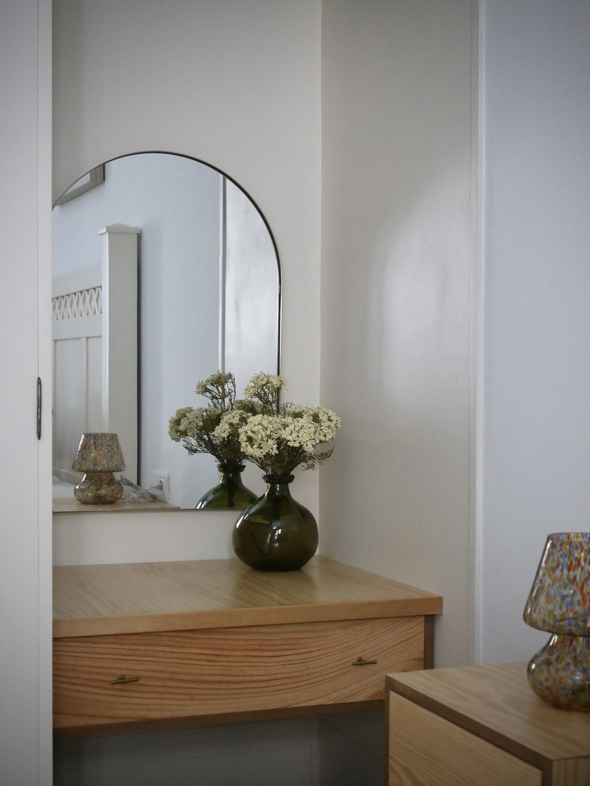 Aprovechamos el hueco sin puerta para hacer un tocador a medida a juego también con estas coquetas mesitas de noche.