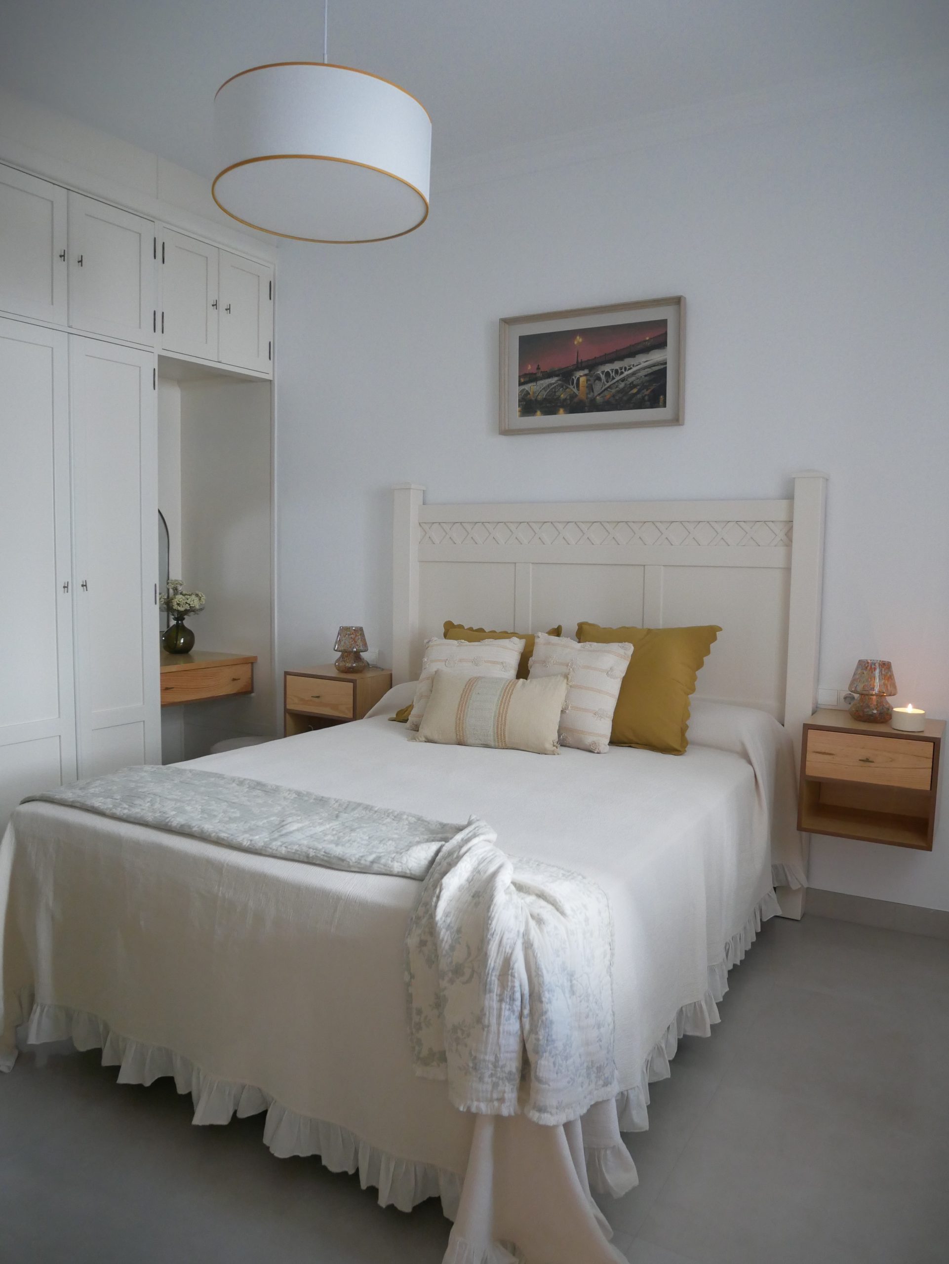 Destacar también el dormitorio principal. El diseño apuesta por conservar elementos fundamentales como el armario, la cómoda y el cabecero, bañados de un nuevo color que dota la estancia de mayor luminosidad.
